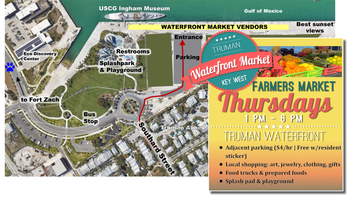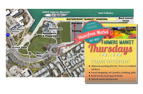When is the Farmer’s Market?Every Thursday, 1 pm to 6 pm, rain or shine. In the event of severe weather, the Market may close early. The Market continues year-round with strong community support.Who should go?The Key West Farmer’s Market is for locals and visitors alike. Residents will find quality items to stock the fridge and pantry, gifts, and home décor—along with the chance to sample new lunch & dinner options. Vacationers will enjoy shopping with a view, reasonably priced food, and plenty to see and do at the Park.Where is the Farmer’s Market, exactly? At the Truman Waterfront Park, at the end of Southard Street. Look for the tents along the Quay by the USCG Ingham on the waterfront..What does it cost?Entrance into the Park and Market is always free. Some vendors do not take credit cards. The closest ATM is at the Green Parrot. Where is parking?There is a large City lot directly adjacent to the market with plenty of parking, handicapped spots, scooter parking and bicycle racks.What does parking cost?The City lot has pay stations that accept credit cards or cash. Rates are $4 per hour, or free for up to four hours with a Resident parking sticker. Handicapped parking is always free and monitoredCan I ride a bus?The Duval Loop bus service is no longer operating; however, the City of Key West now offers Key West Rides, an on-demand shared ride service accessible through the Key West Rides app on the Apple App Store and Google Play.What kind of vendors?Each week you’ll find traditional farmer’s market offerings including produce, seasonal fruits, cheese, pickles, nuts, honey, seafood, fresh breads, sauces, desserts and more. There are food stands and food trucks, along with artists, crafters, jewelry makers, clothing vendors, flea market goods, and local organizations. It’s an eclectic mix of small businesses offering one-stop shopping at a weekly pop-up island bazaar.What kind of food options?A rotating lineup of prepared food vendors and food trucks adds to the experience. Offerings may include Indian, Mediterranean, BBQ, seafood, Argentinian specialties, Mexican favorites, Colombian empanadas, classic American fare, mini donuts, boozy pops, fresh-pressed juices, and a popular coffee truck. Most food vendors are ready shortly after noon—perfect for a late lunch or picnic dinnerCan I bring my pet?Well behaved pets are welcome. Please be sure to bring water and bags and visit our dog-centric vendors for treats!Where are restrooms?Restrooms are located within the splash park/playground area. There’s also a water fountain.Can we have a picnic?Absolutely. Grab lunch or dinner from the vendors and enjoy the park. You may want to bring a blanket or lawn chair, and an umbrella for shade during the warmer months.How long should I plan to spend there?Most visitors spend 45 minutes to 2 hours browsing, shopping, eating, and enjoying the waterfront.What else is there to do at the park?Truman Waterfront park features a splash park, playground and lots of grass to spread out a picnic. Restrooms & shower rinse.Fitness, walking and biking trailsDog Park with agility equipment, seating and shadeThe USCG Ingham is a self-guided maritime museum open Tuesday – Saturday 10 am to 4 pm. $18 adults/$5 kids/$5 active military.The Quay faces the Gulf and often cruise ships and Navy cutters on duty will be parked nearby. There’s plenty of park benches to enjoy the view (but little shade, umbrella recommended),Fort Zachary Taylor Beach & State Park is a National Historic Landmark on 54 acres and houses a civil war fortress and the best beach on Key West.Entrance fees start at $2.50 pedestrians, $6 per vehicle and up. Florida Keys Eco Discover Center is a kid-friendly & adult interesting educational exhibits open from 9 am to 4 pm. Admission is free.Look for special events and concerts at the Coffee Butler AmphitheatreHow do we get a booth there?Visit Key West Farmers Market on Facebook and click the Sign Up button or call Sean K at 305.731.3385Do you need volunteers?Yes! Volunteers serve as ambassadors and greeters to the show, answer questions and make sure everyone has the best experience possible. Send an email to info@kwfarmersmarket.com or call Sean K at 305.731.3385Help us be green! We prohibit single use plastics and straws. Recycling is hip and good for our environment. Please do not litter and take caution trash doesn’t blow into the ocean. We are a ZERO waste event which means you must take your trash with you or return it to the vendor from which you purchased. Carpool, bus or bike and remember your reusable bags.The entire park and Market area, restrooms and parking lots are wheelchair accessible.